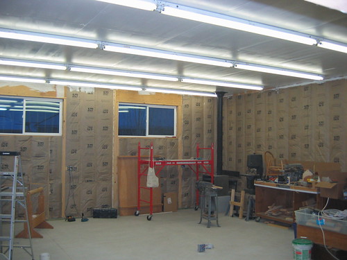 The lighting is beautiful to my eyes - pretty much drafting room quality. Its fifteen dual-tube 8' fixtures (T-12), for the 28X30 space. About 1900 watts total. I have it wired on two 15A circuits. I haven't yet "split the ballasts", but will do that. When that is done, I'll have the ballast in each fixture light just one tube in of its own and one of a neighboring fixture. That way I can have uniform lighting at 50% and 100%, depending on the need at the time.